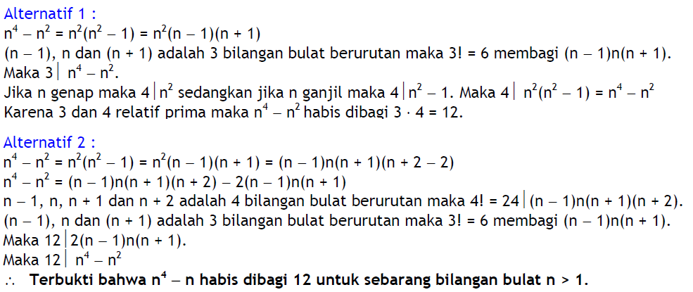 1). Buktikan bahwa $n^4-n^2$ habis dibagi oleh 12 untuk sebarang bilangan bulat $n > 1$.
