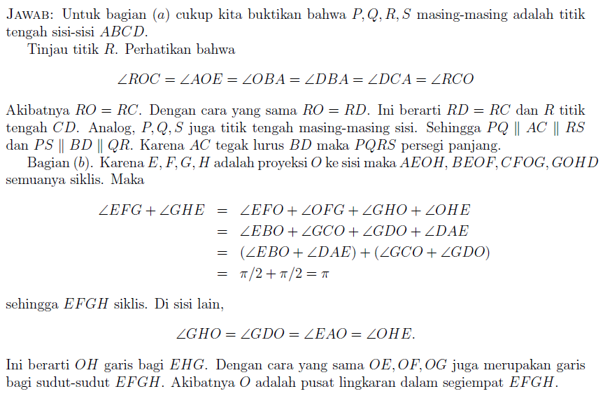 1). Diberikan segiempat talibusur ABCD dengan kedua diagonalnya saling tegak lurus dan berpotongan di titik O. Garis tegak lurus dari O pada AB; memotong AB di E. Garis tegak lurus dari O pada BC, memotong BC di F. Garis tegak lurus dari O pada CD, memotong CD di G. Garis tegak lurus O pada DA, memotong DA di H.